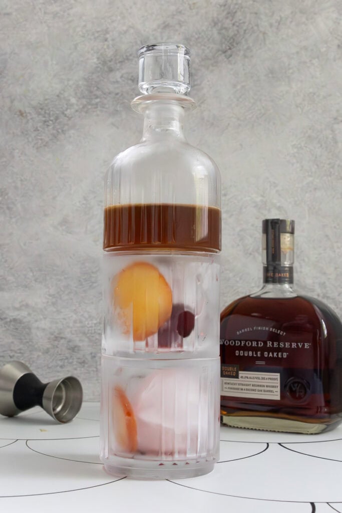 You should use whatever your own favorite bourbon is, since there are so many subtleties in flavor that will come through in the cocktail. My bourbon of choice is Woodford Double Oaked, which has a smoky flavor. That's what is pictured here.
